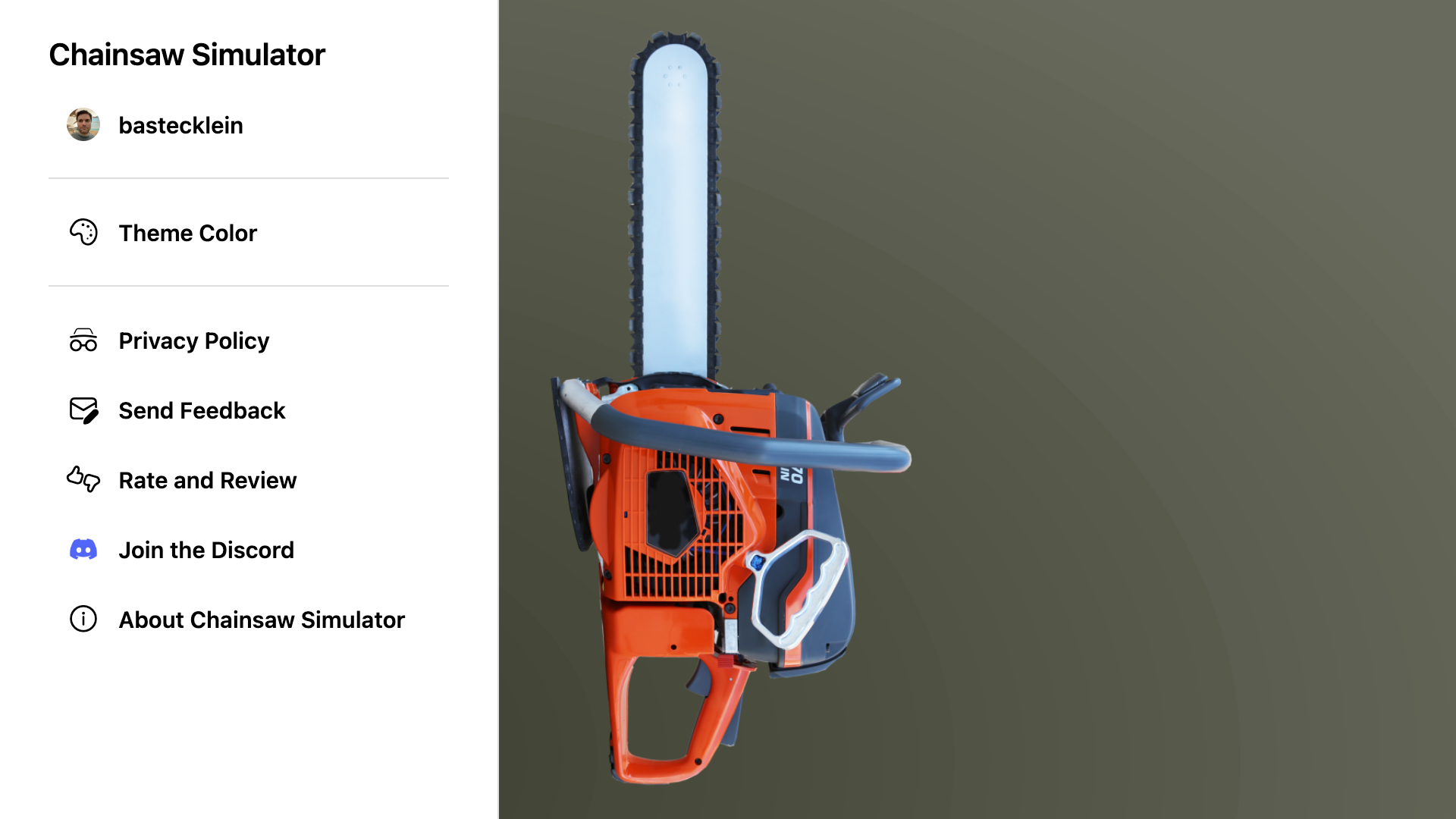It's a chainsaw simulation. This app shows a picture of a chainsaw and when you press down on it, it makes cutting noises and vibration. Use it to play fun chainsaw related games with your friends. Includes fun customization options too!