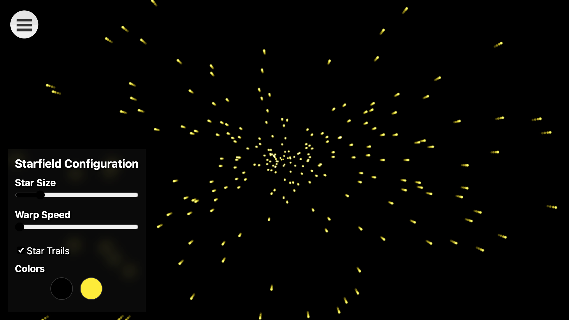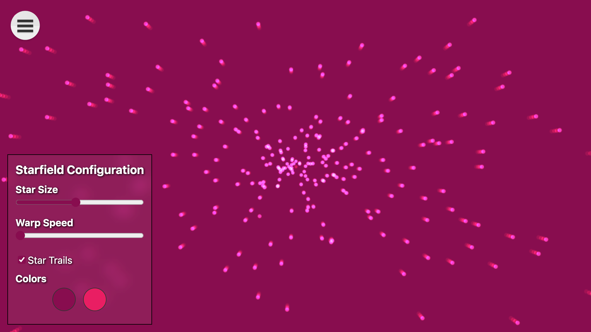 Starfield Simulator visualizes a classic star field simulation particle effect, just like the old school screensaver. The difference is that this star field simulator allows you to fine tune the simulation effect, giving you options to control the warp speed, star size, space color, and star color. Engage!