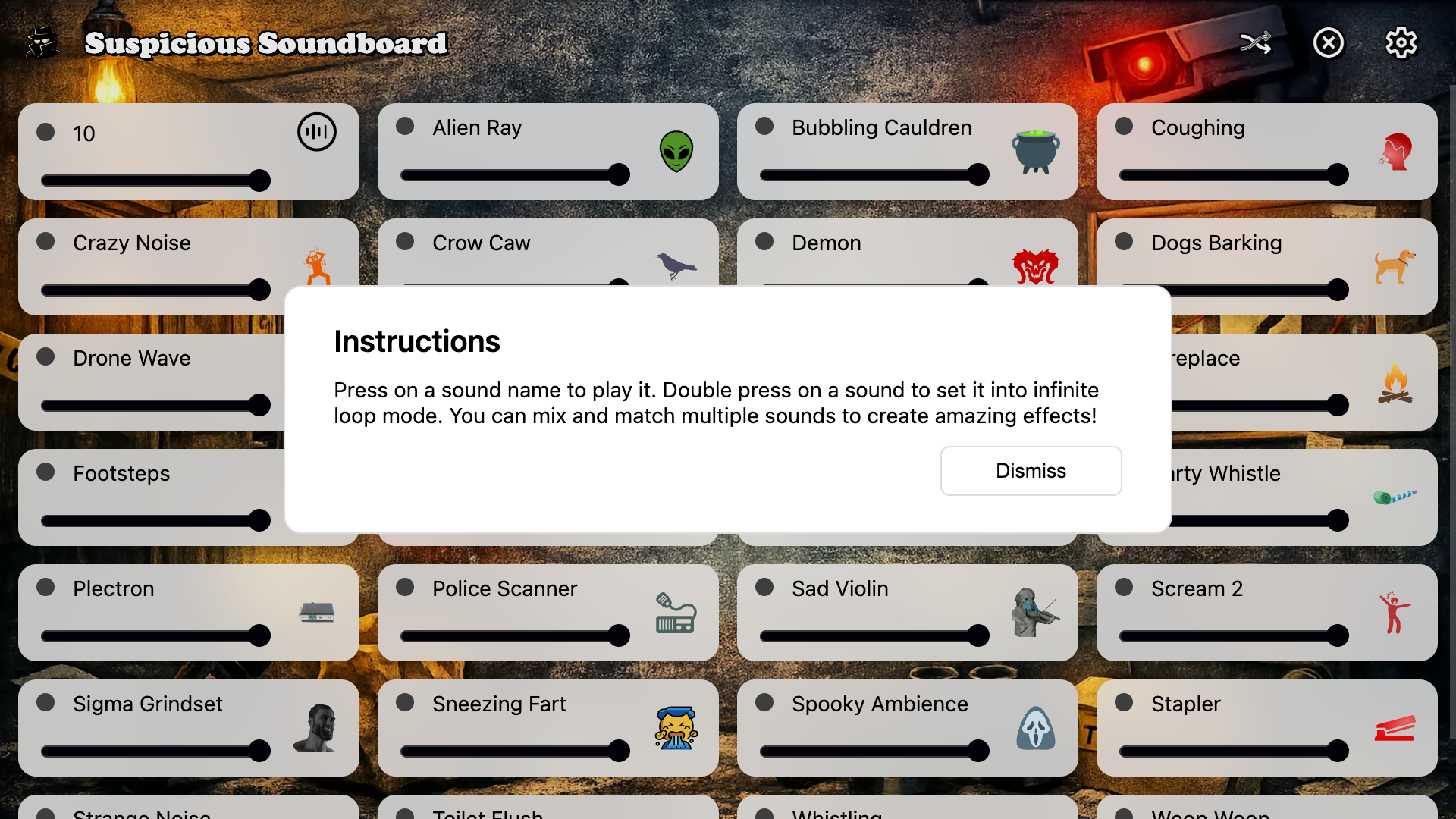 Step into the world of questionable noises, mysterious moments, and "what was THAT" energy. Suspicious Soundboard is your all‑in‑one collection of sounds that feel... off. Not dangerous, not scary - just suspiciously suspicious.